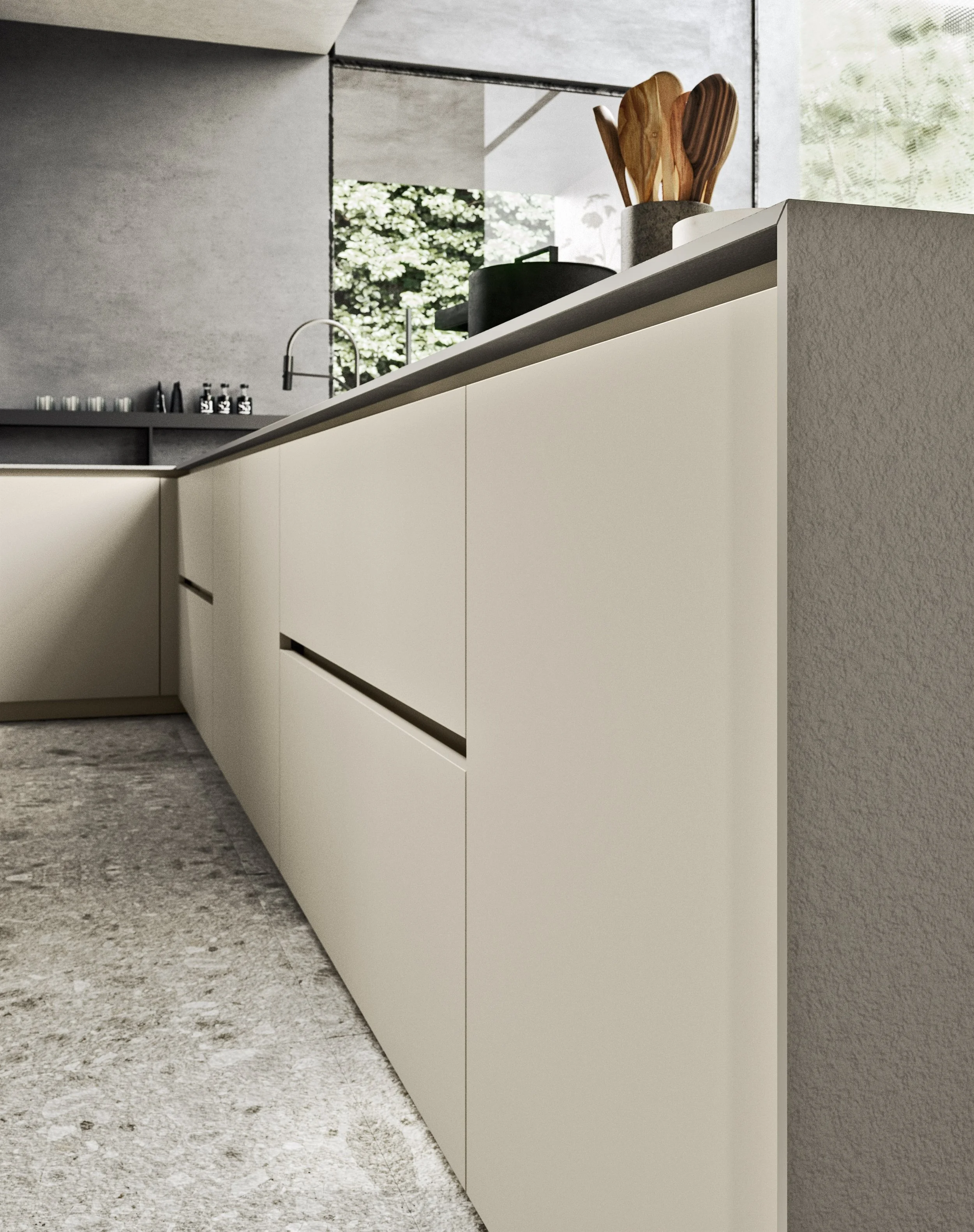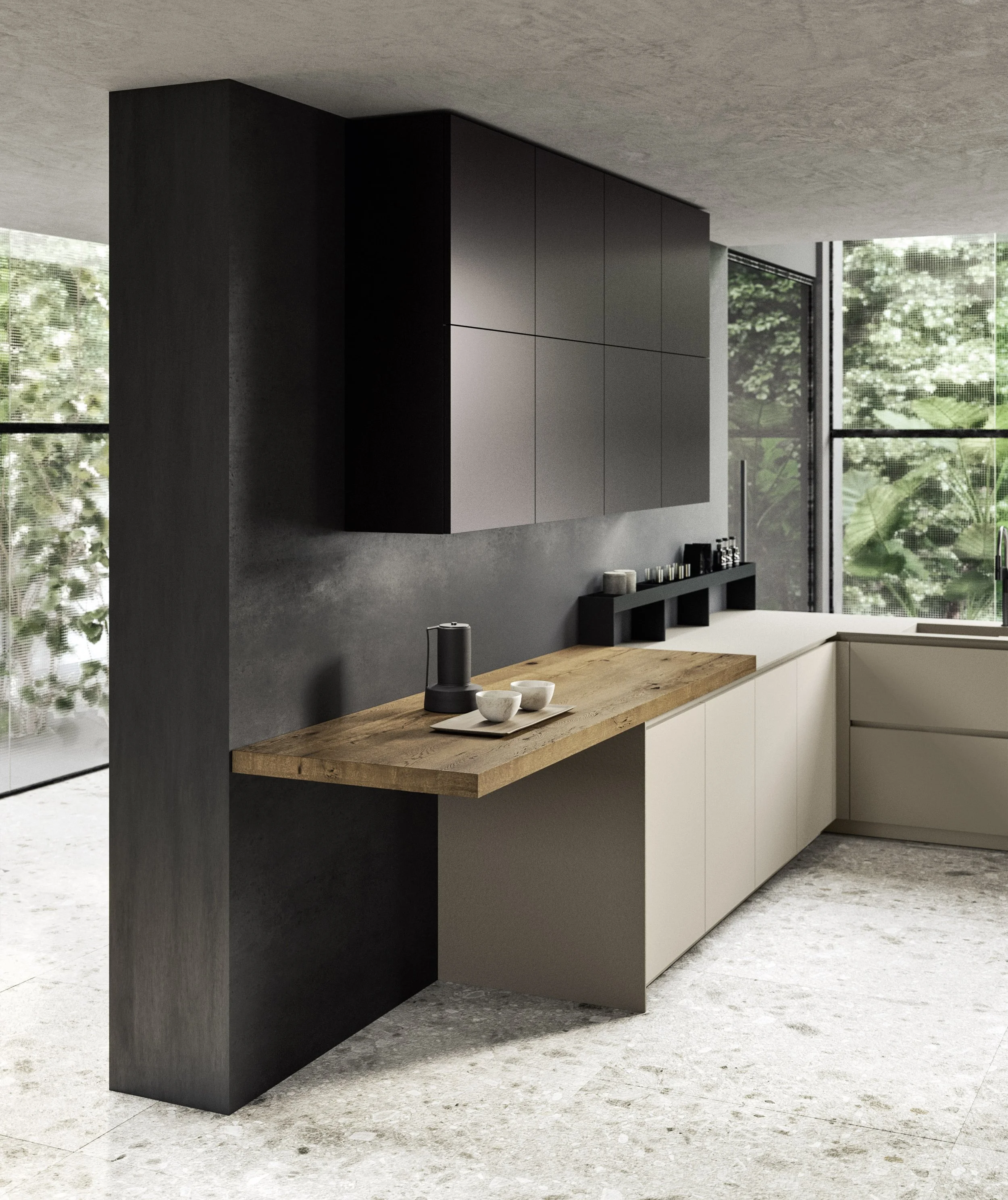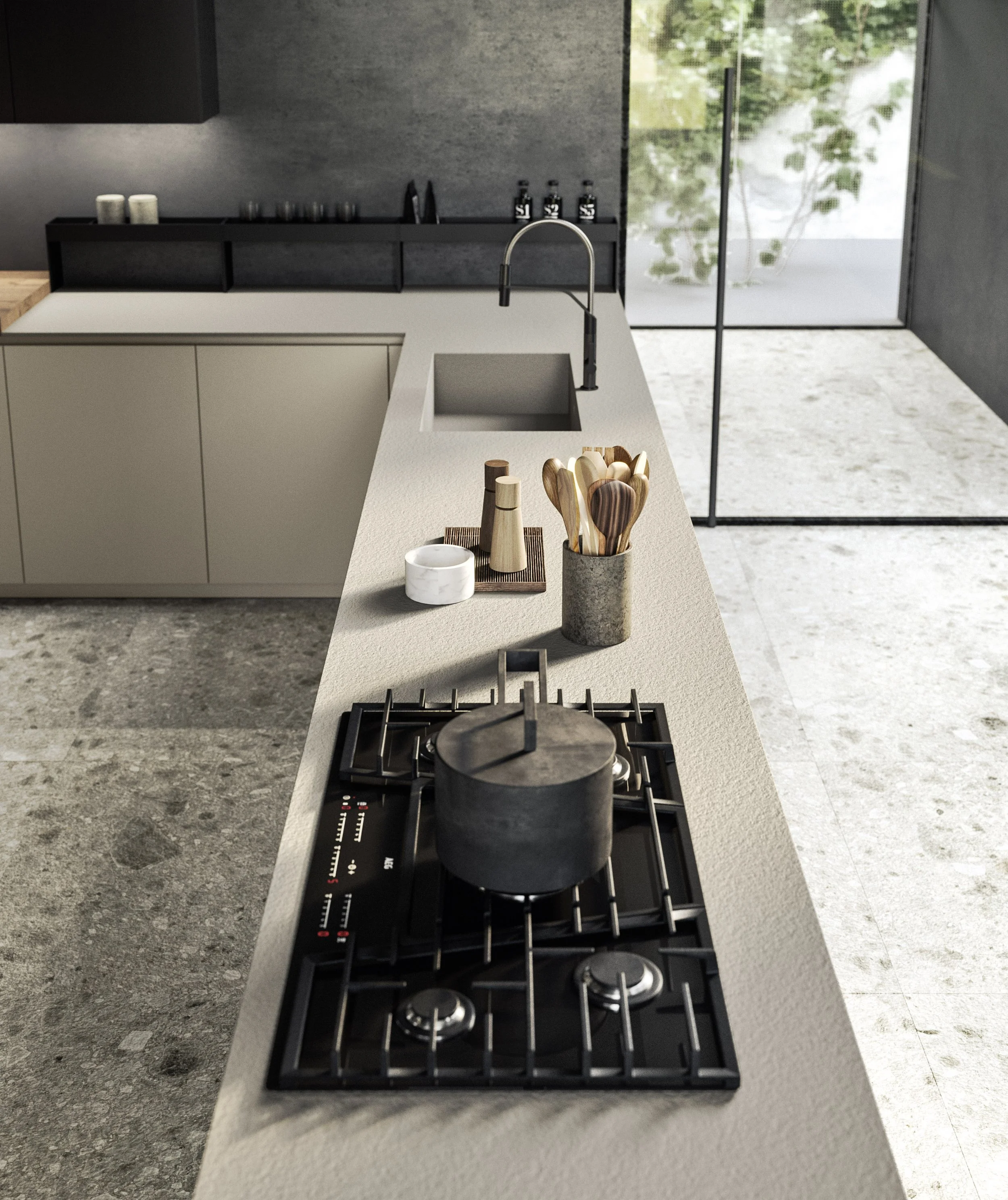 The Arkè No. 1 composition reimagines the kitchen as a singular, expansive living area. By dissolving the boundaries between kitchen tasks and home life, it creates a space where diverse functional zones alternate with a sense of perfect formal and aesthetic continuity.