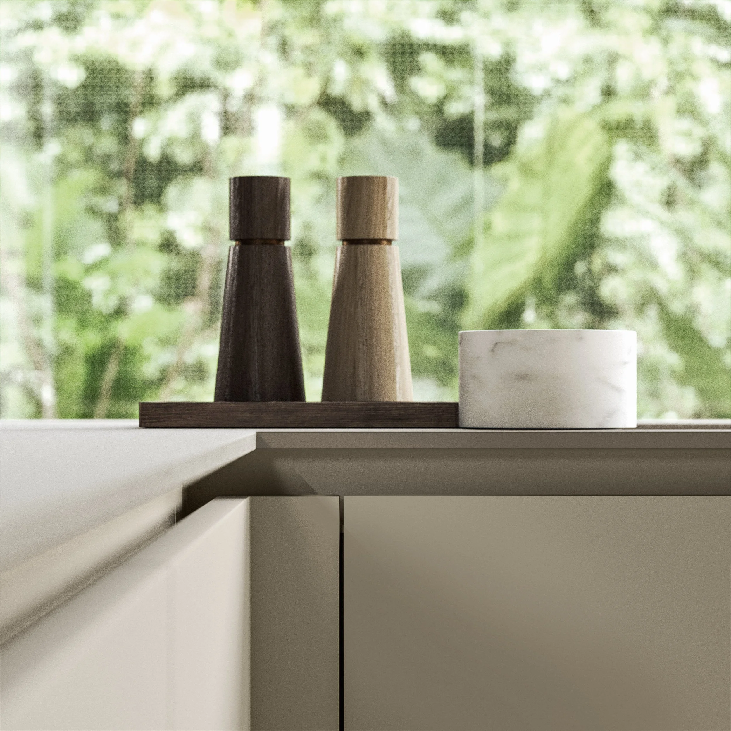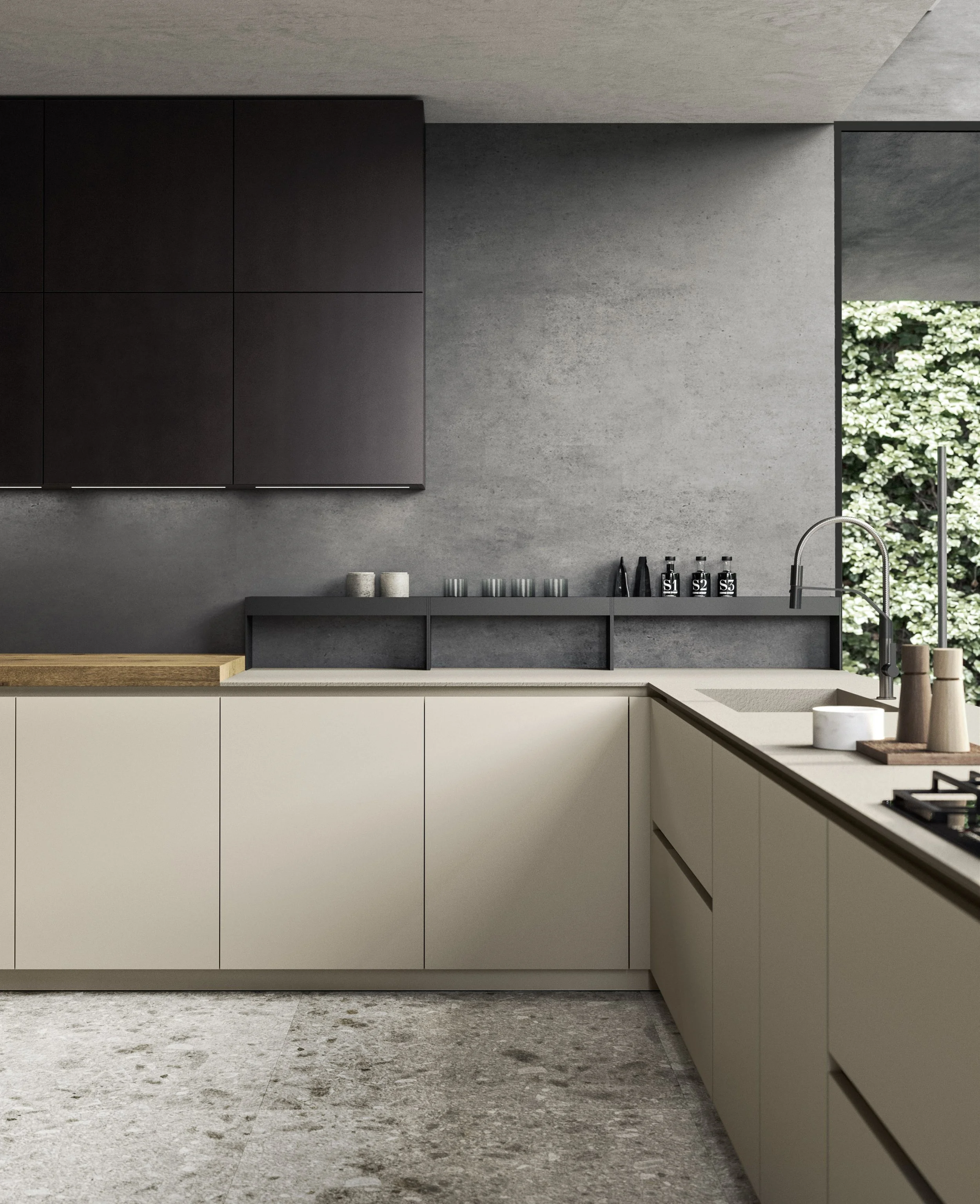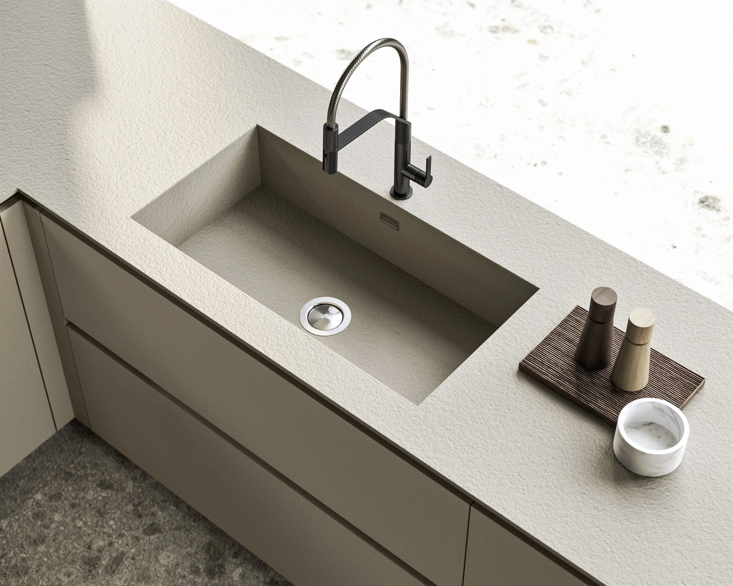 The Arkè No. 1 composition reimagines the kitchen as a singular, expansive living area. By dissolving the boundaries between kitchen tasks and home life, it creates a space where diverse functional zones alternate with a sense of perfect formal and aesthetic continuity.